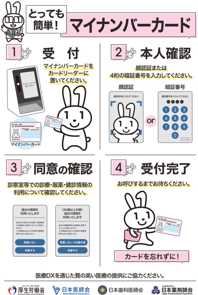 • マイナンバーカードの健康保険証利用について利用しやすい環境を整備し、医療DXを通じて質の高い医療を提供できるよう取り組んでおります。